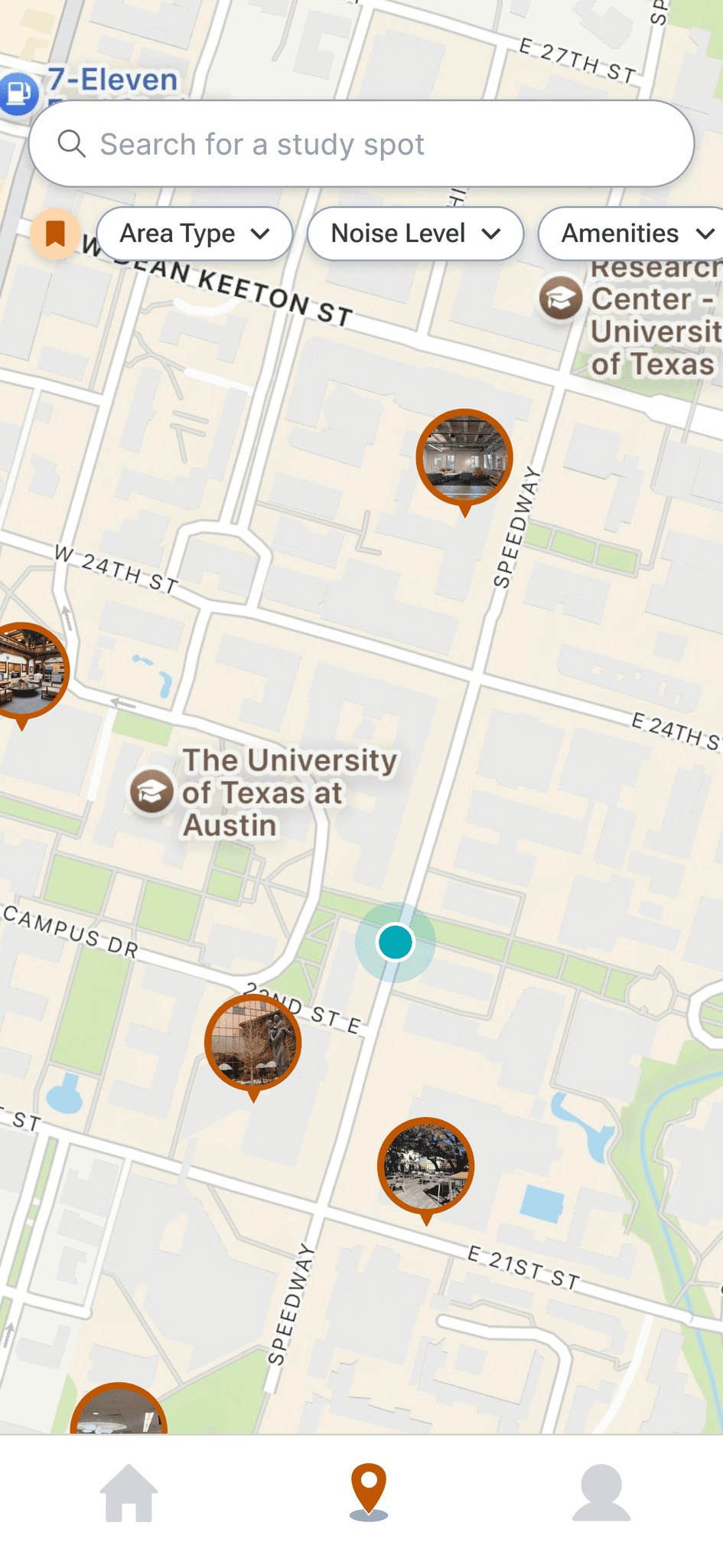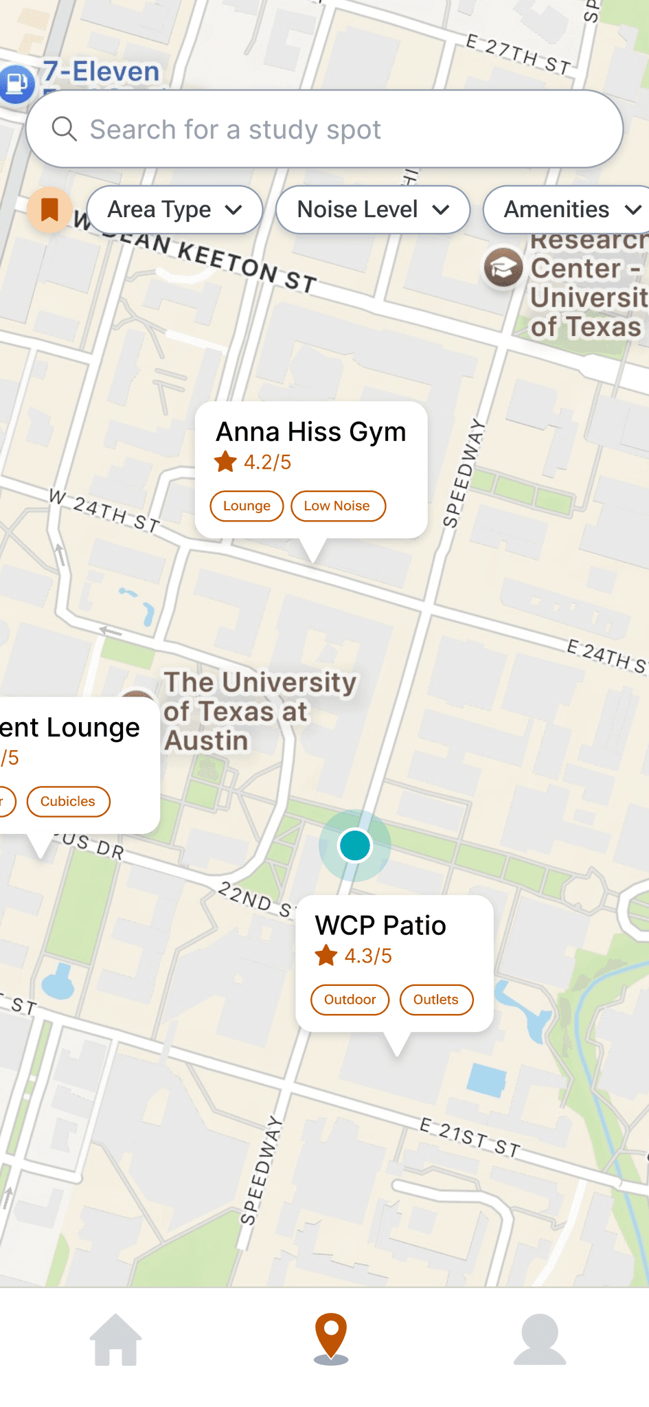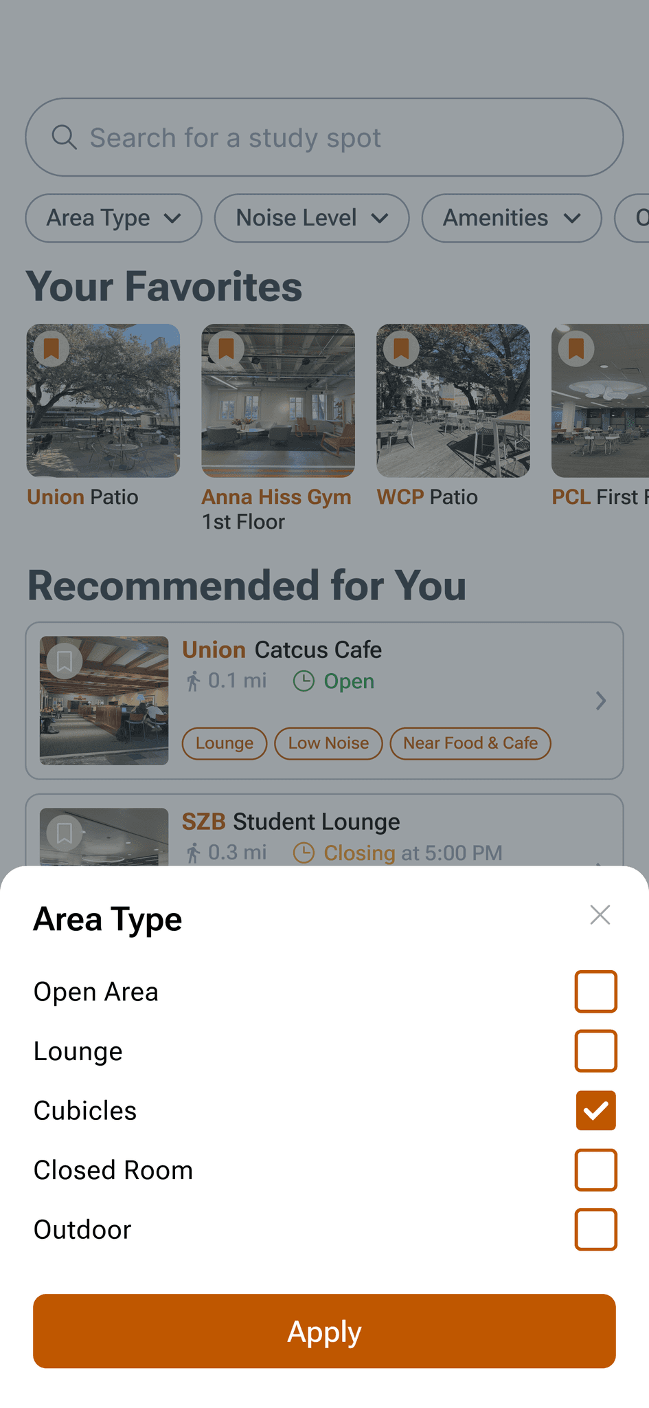 Users can quickly narrow down study spot options using filters tailored to their environment needs and desired amenities
