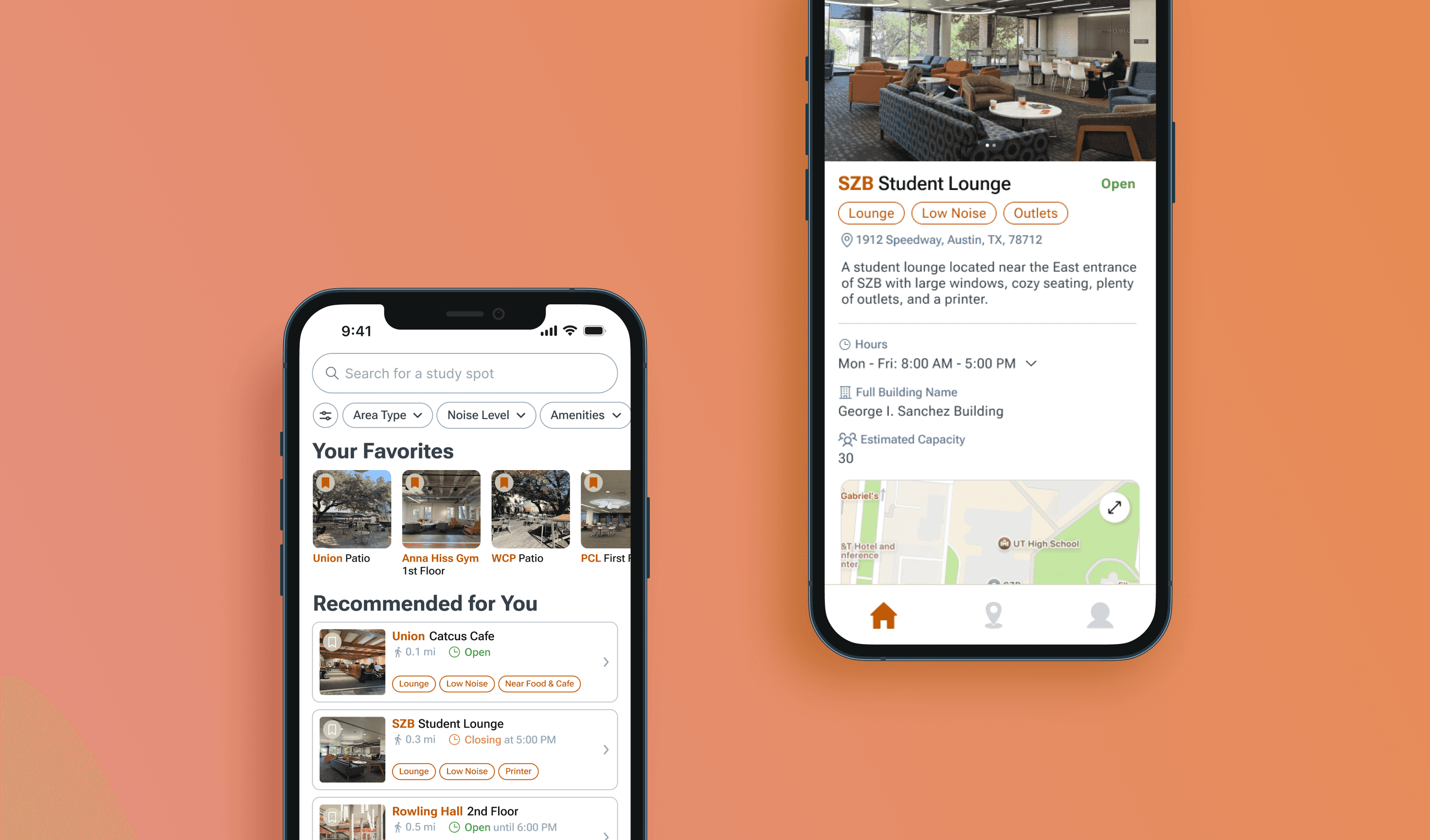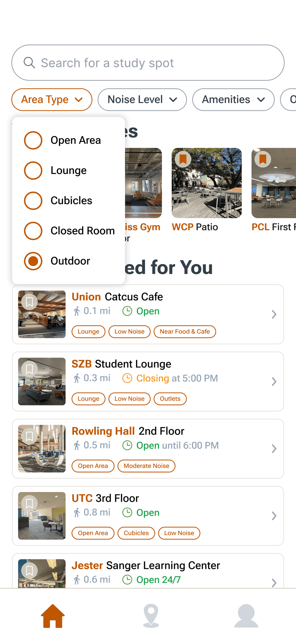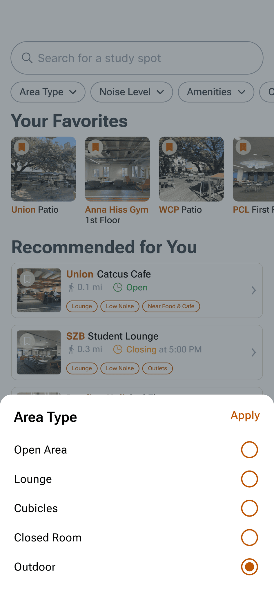 Enables both personalization with the favorites section and easy study spot discovery with recommendations curated to the user