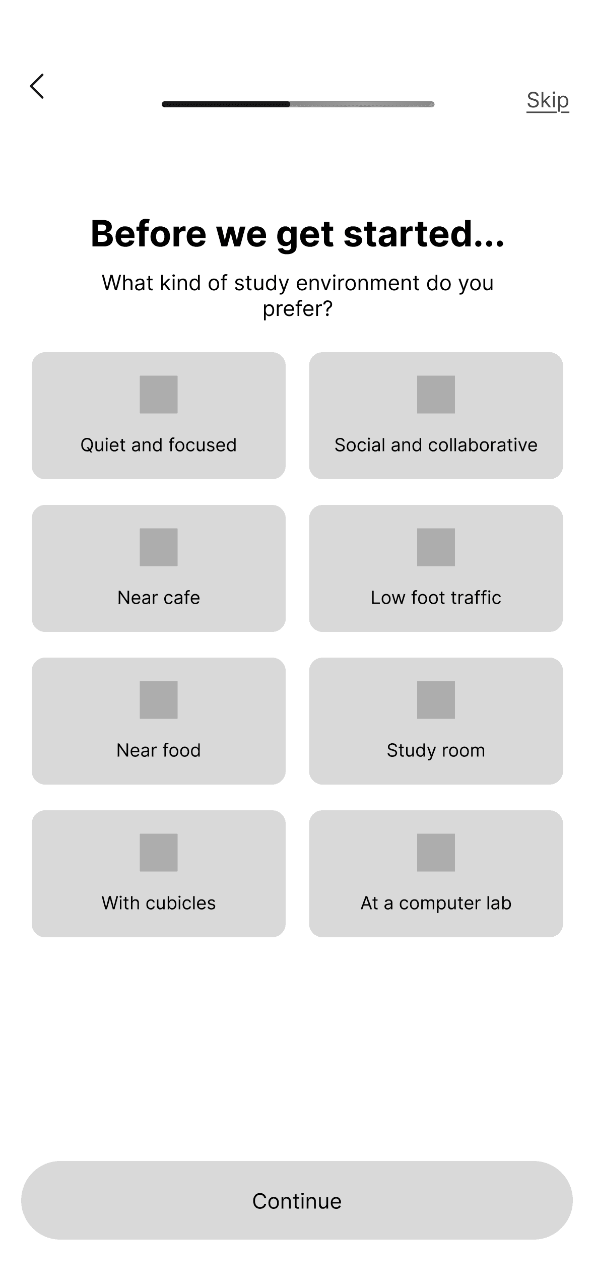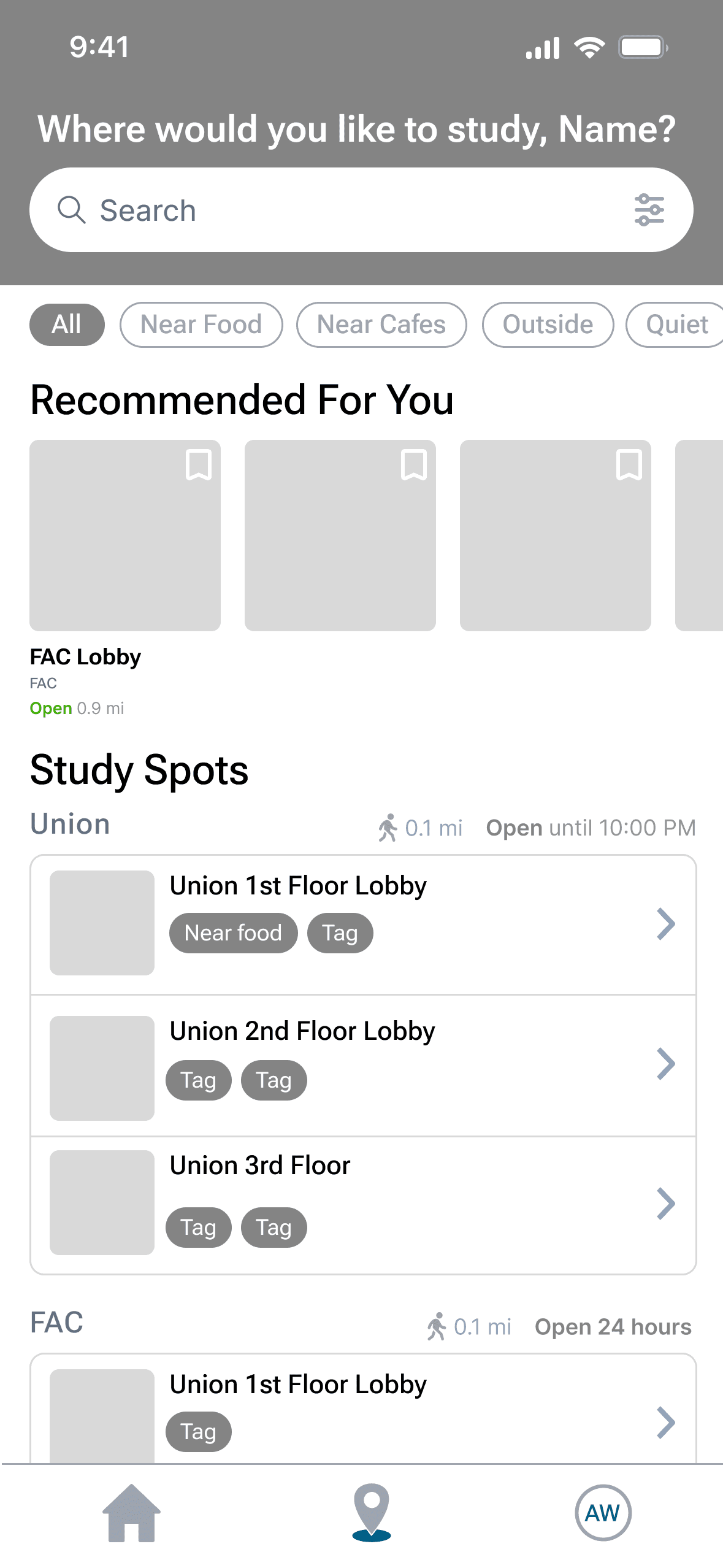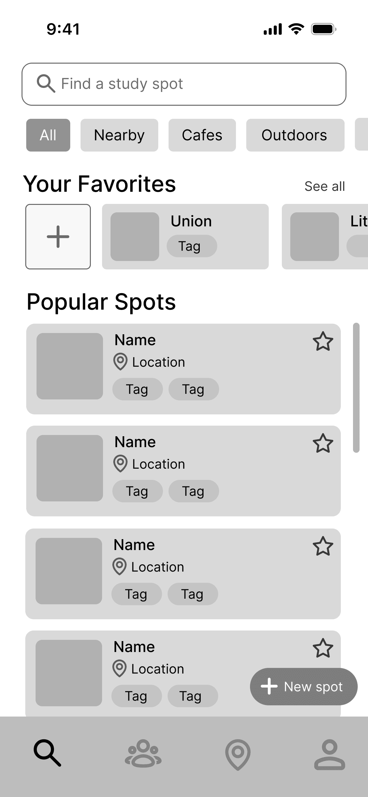 Low to mid fidelity iterations of the home page layout, study spot cards, and map view.