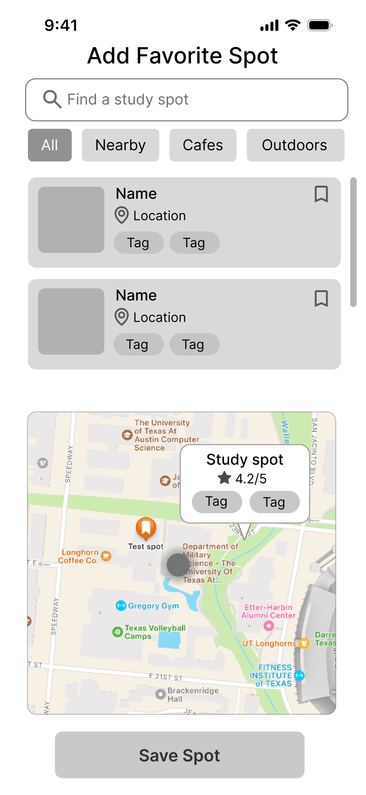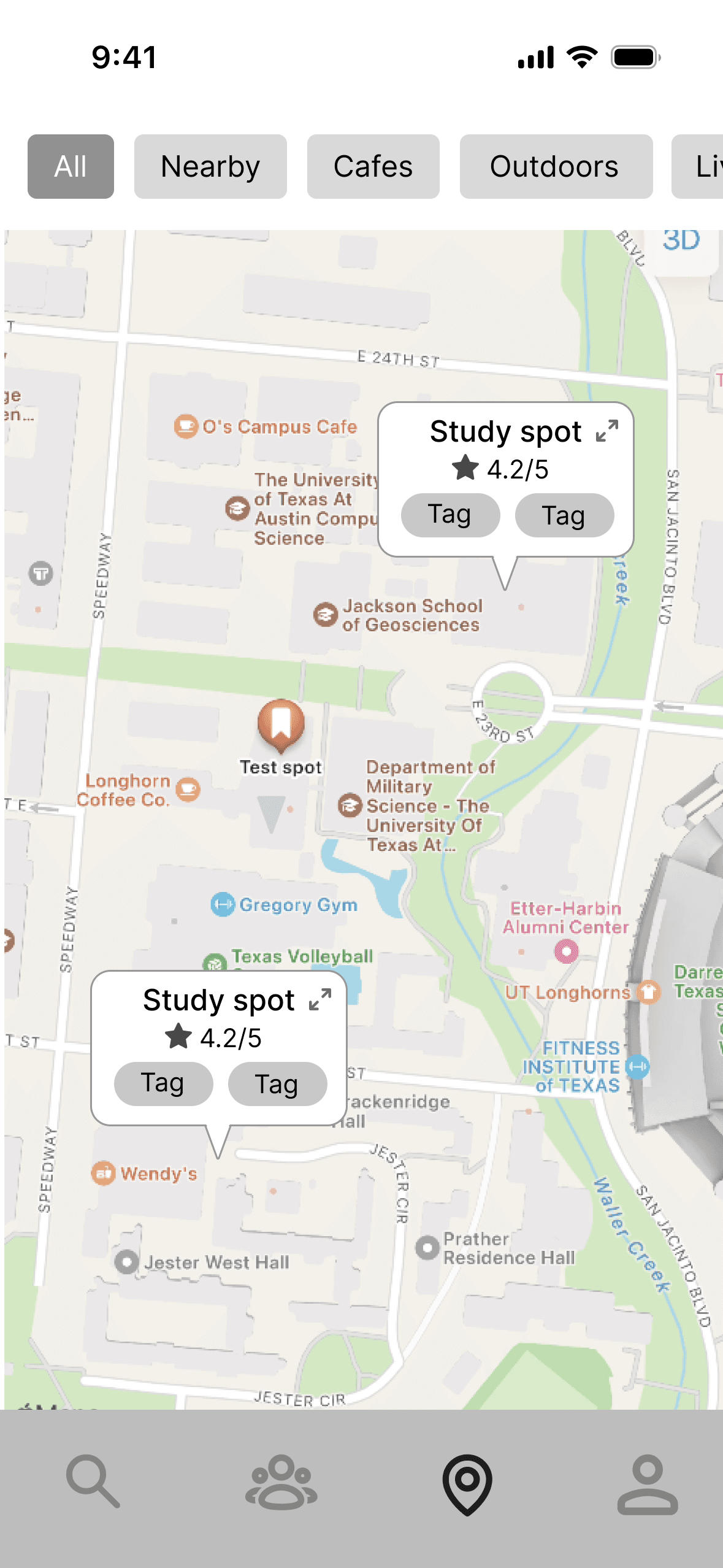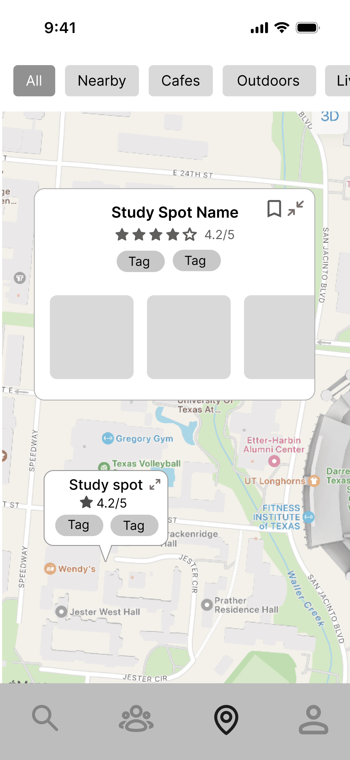 Option B was able to show the study spot tags, but my developers were worried about scalability because when the map view was much more populated, too many textual pins would be overwhelming to view at once.