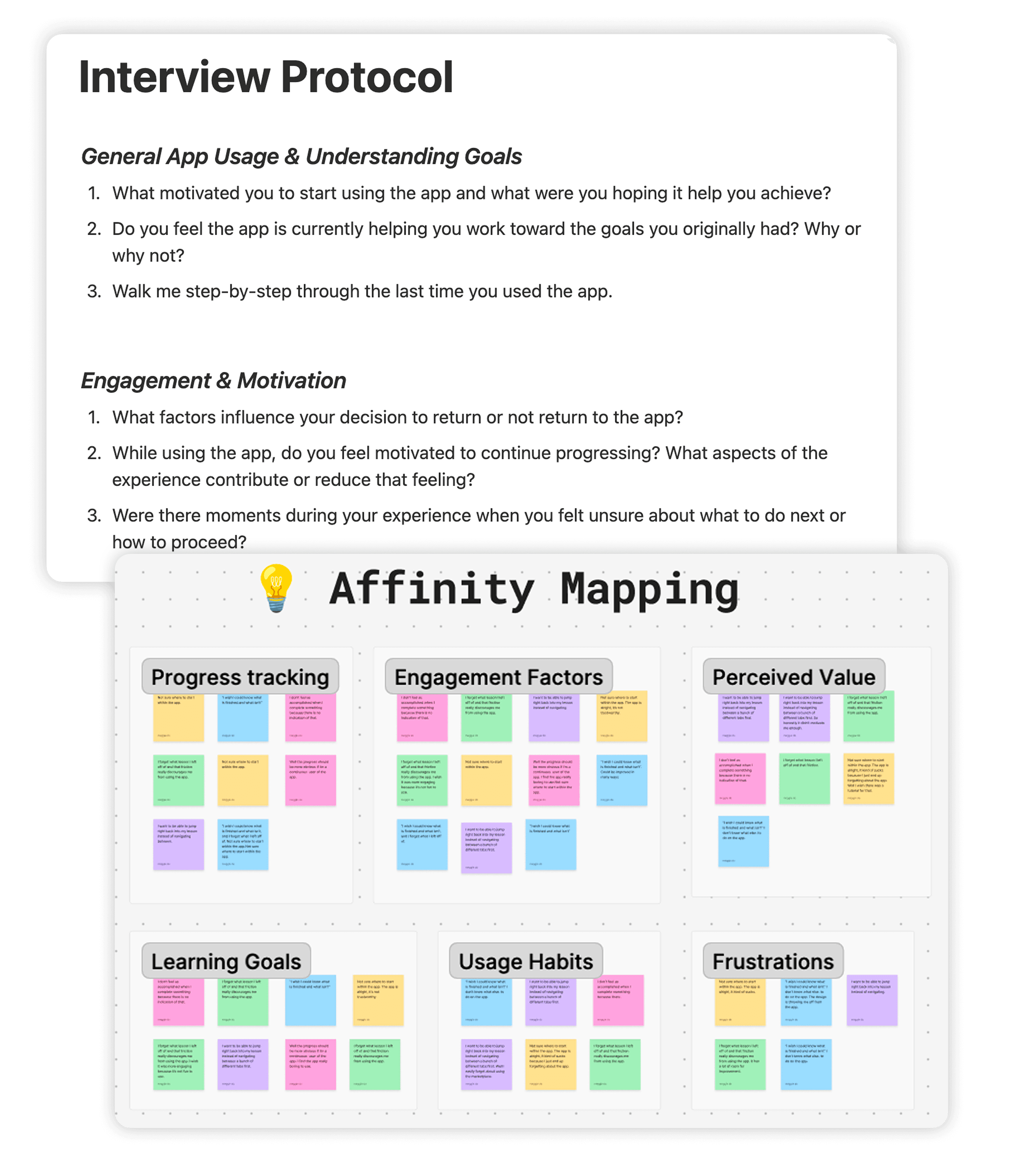 I conducted 5 interviews with users to uncover the causes of low engagement. After synthesizing the user insights, I identified the key pain points that were hindering motivation and app usage.