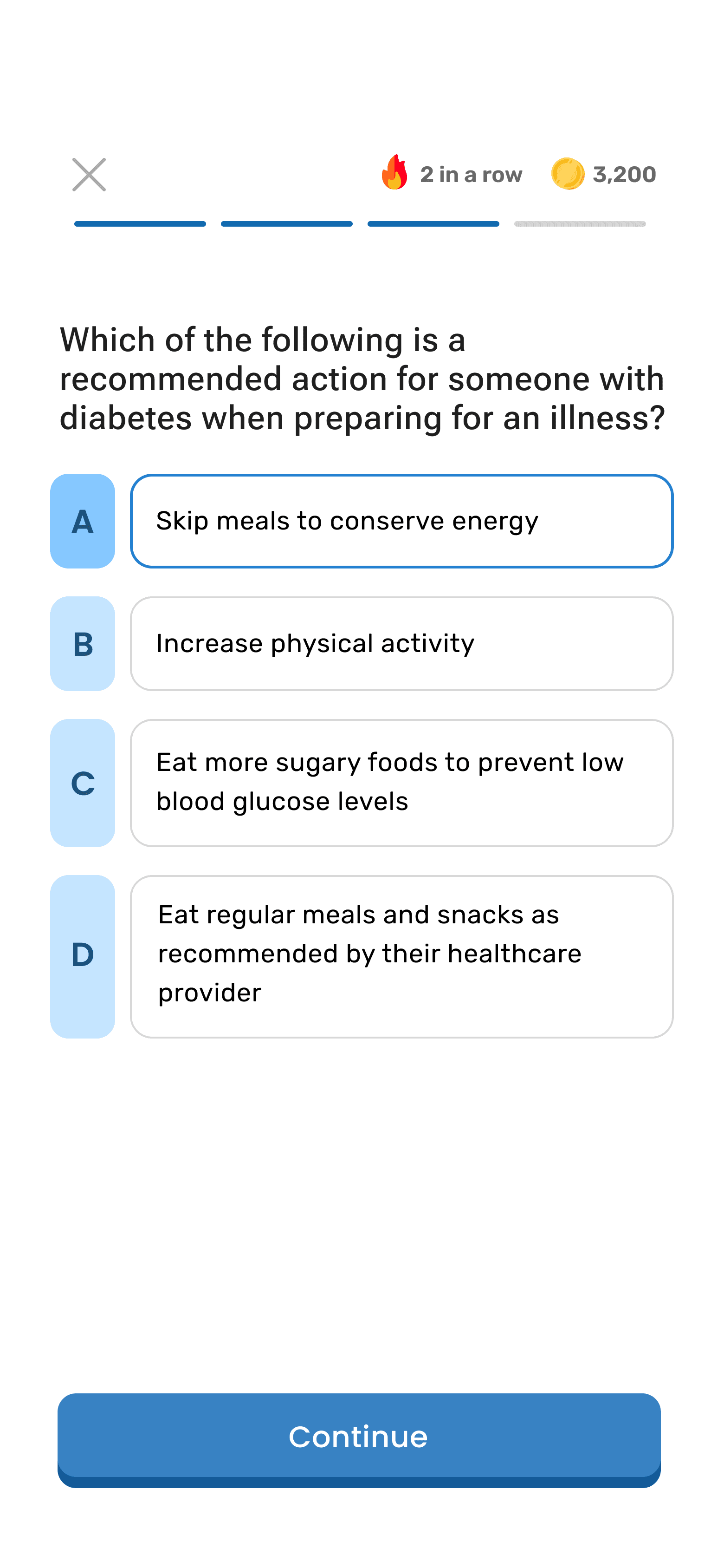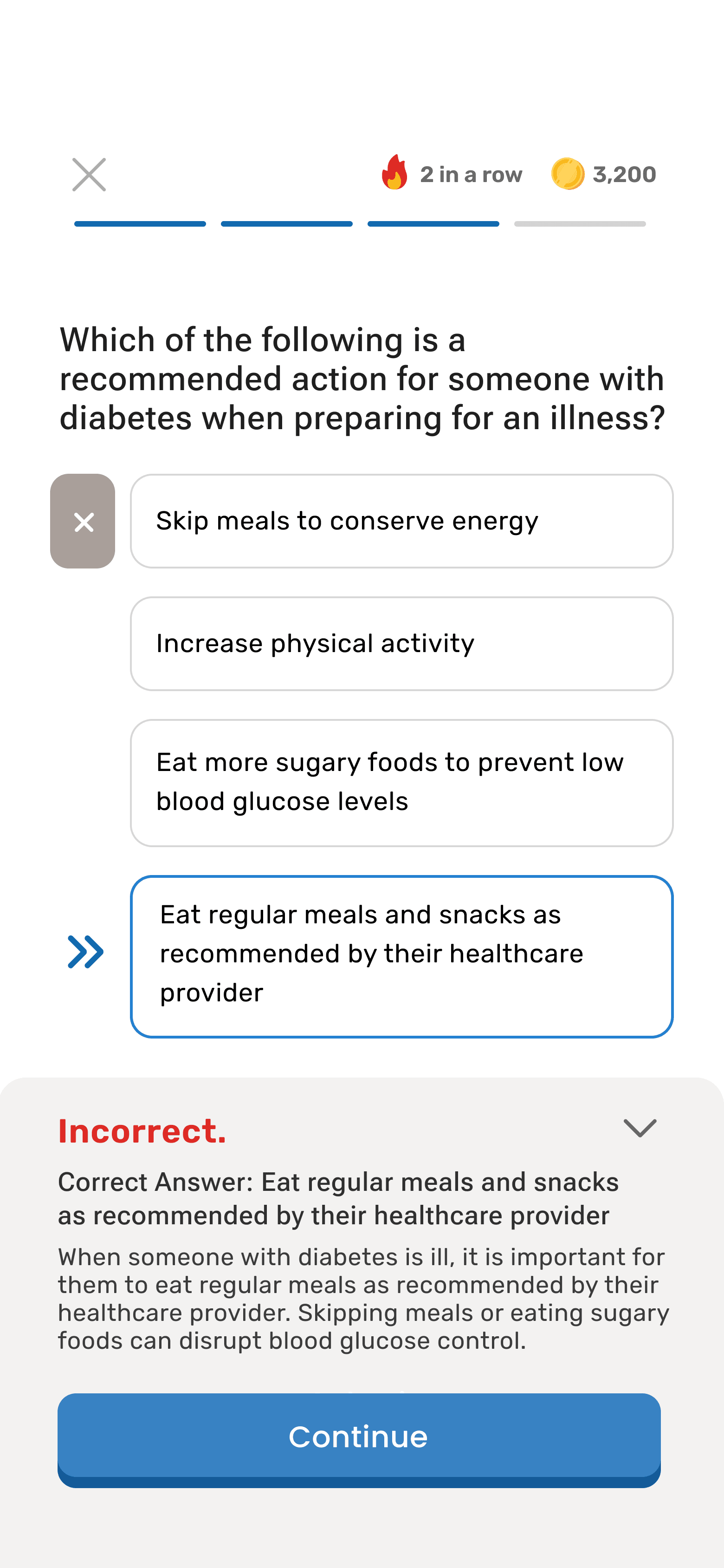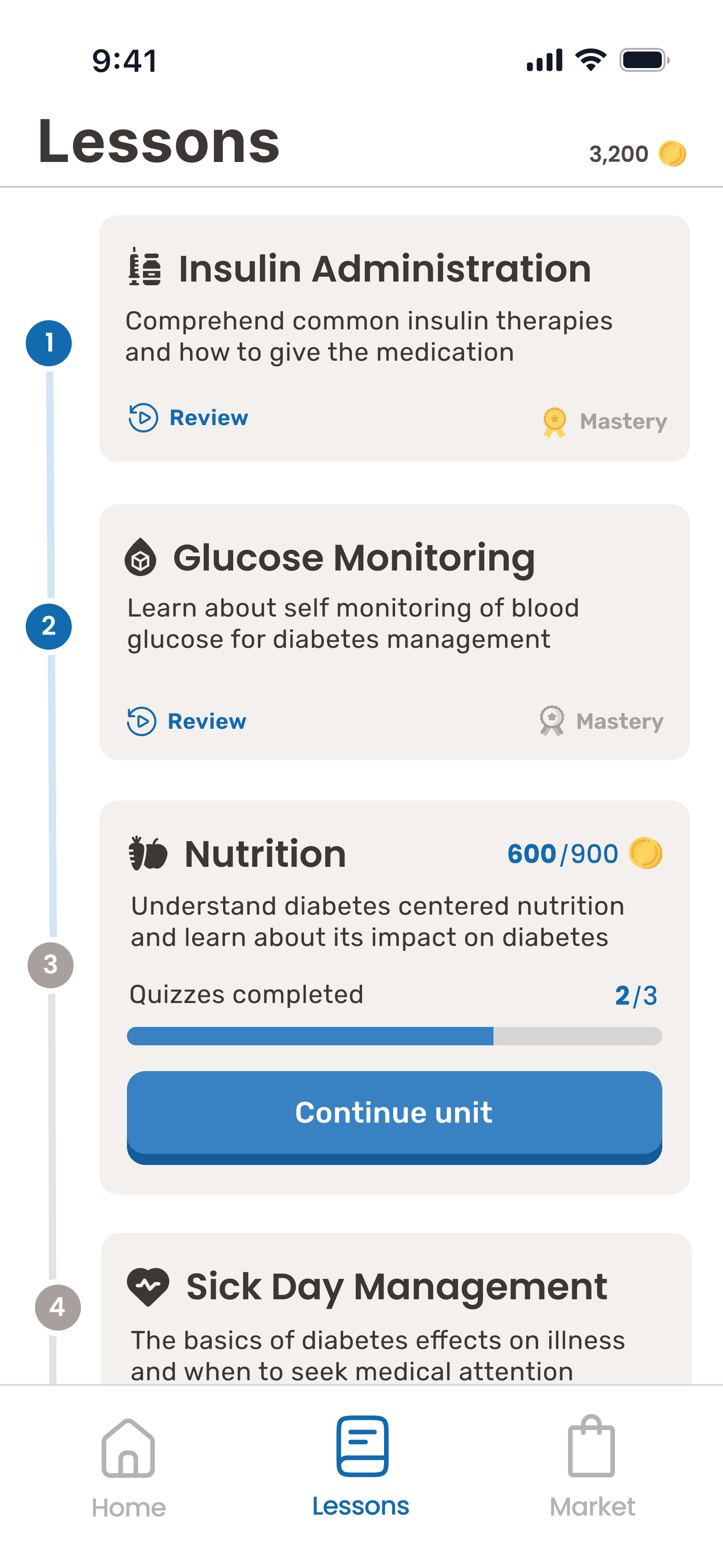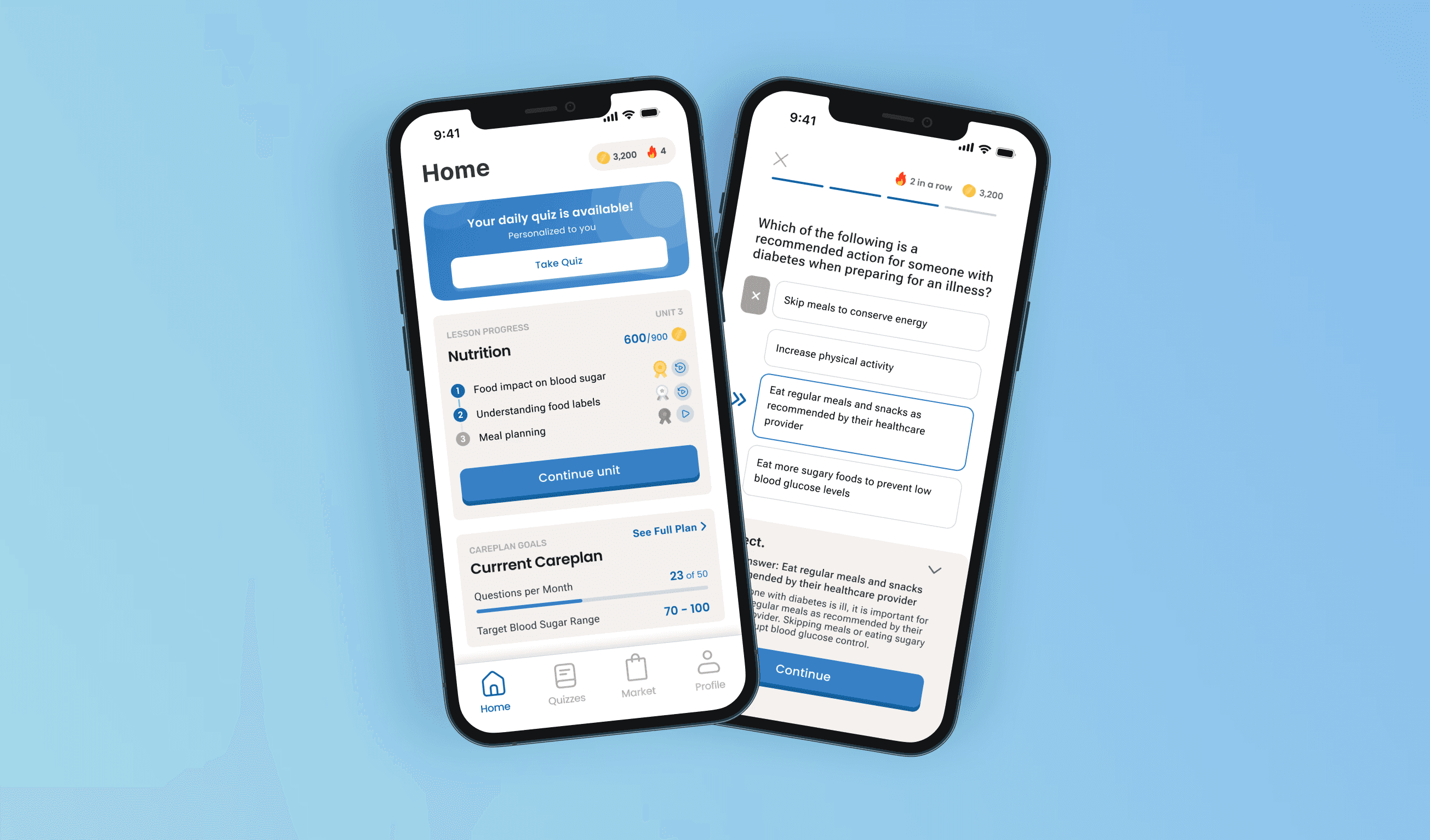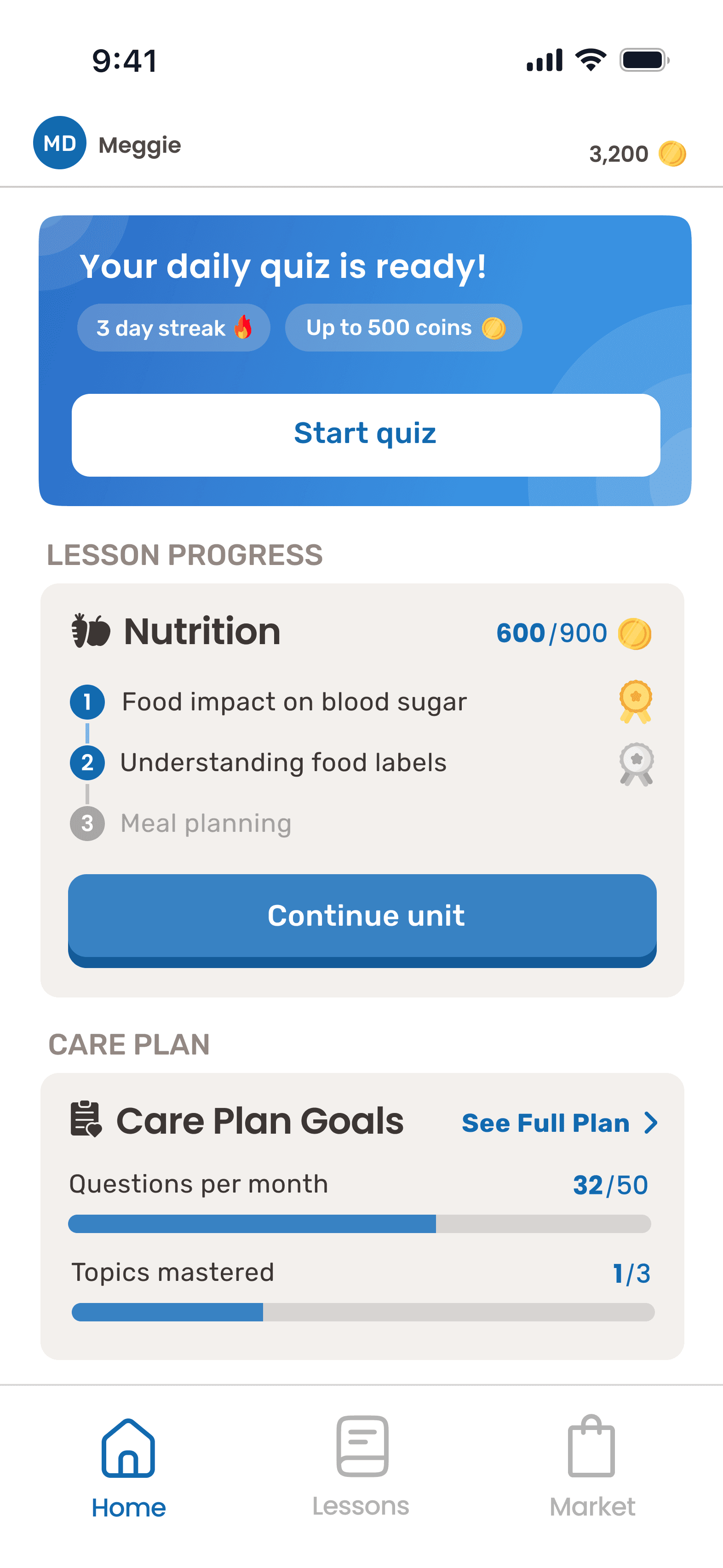 Redesigned core lesson, home, and quiz screens to reduce cognitive load and improve content comprehension for diabetes patients